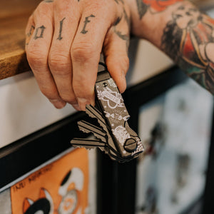 Each piece features iconic tattoo artwork precision-etched into military-grade materials, harkening back to the golden age of American tattooing.