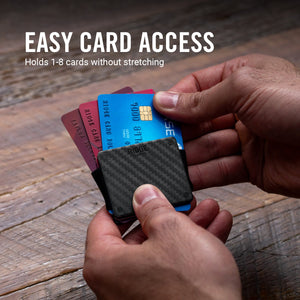 This ultra-minimal carrier holds 1-8 cards and requires less pocket space than a zippo lighter.