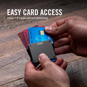 This ultra-minimal carrier holds 1-8 cards and requires less pocket space than a zippo lighter.