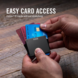 This ultra-minimal carrier holds 1-8 cards and requires less pocket space than a zippo lighter.