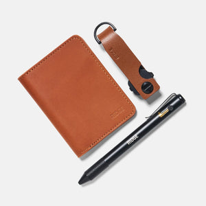 Meet our new Leather Collection—where we've applied a time-honored material to our innovative gear, designed for everyday and crafted to last.The Wallet + Keycase + Pen Kit is the perfect everyday trio. With over 100,000 5-star reviews, we know you're going to love it. This Kit includes the Cash Strap Ridge Wallet, Keycase, and Bolt Action Pen.